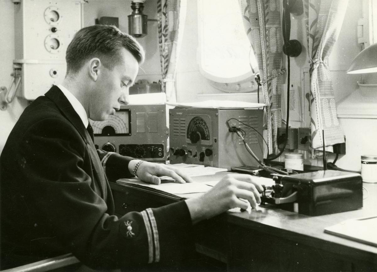 Radiotelegrafist ombord på okänt fartyg tillhörande Svenska Orientlinjen. Mitten av 1900-talet.