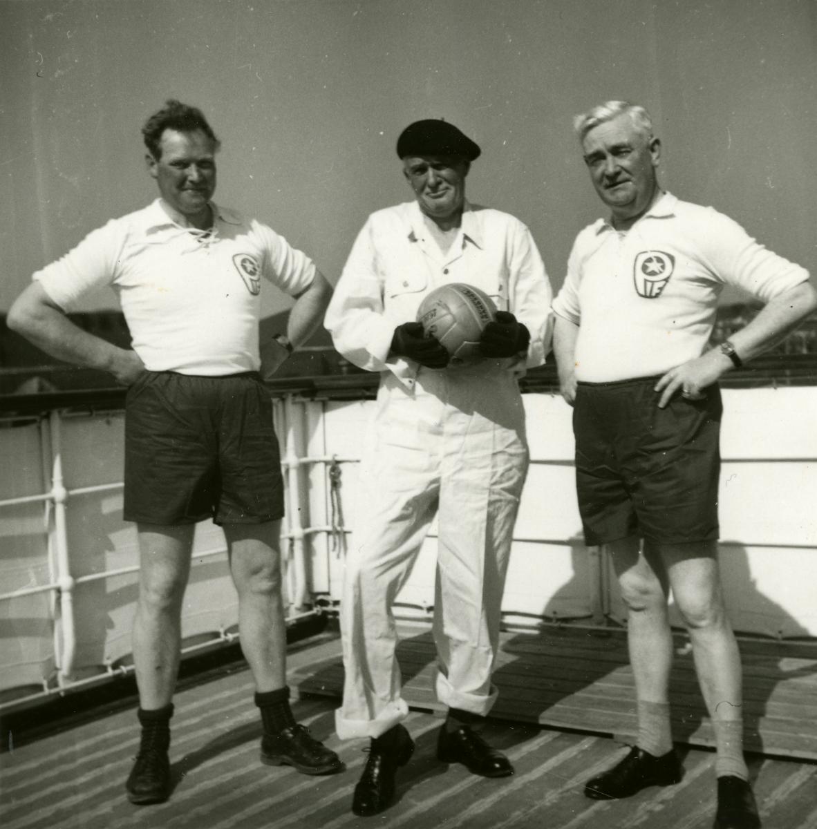 Tre besättningsmän ombord på PATRICIA poserar med en en fotboll.