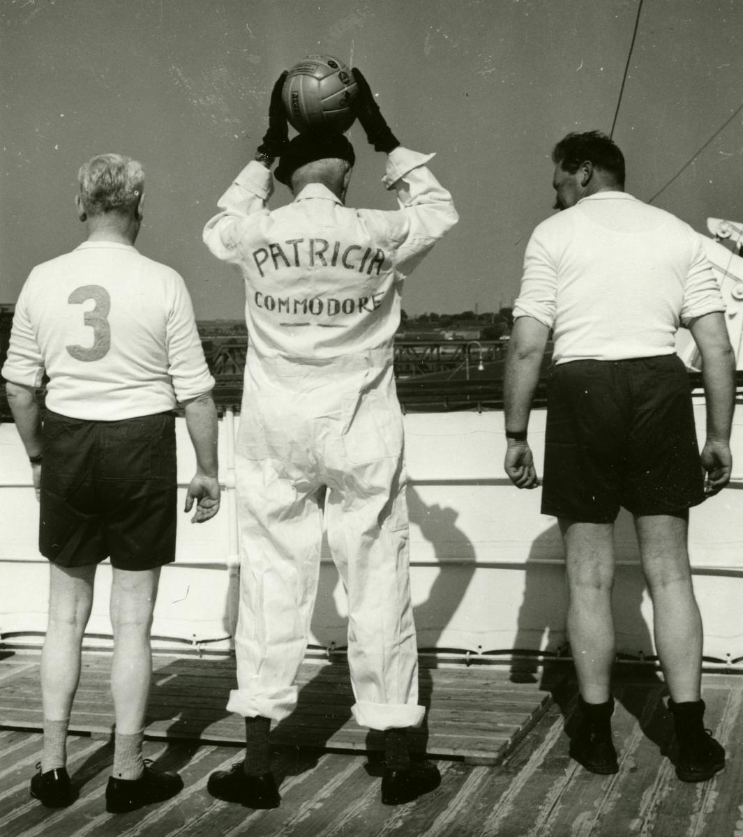Tre besättningsmän ombord på PATRICIA poserar med en fotboll.