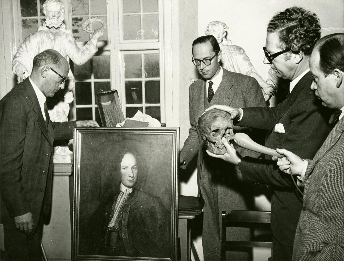 Från vänster Dr. Albert Sandklev, Varberg, Gathenhielms förmodade porträtt, professor Jan Mellgren, Göteborg, Dr. K.G. Gejvall, Stockholm med Gathenhielms kranium och professor Carl-Herman Hjortsjö, Lund.