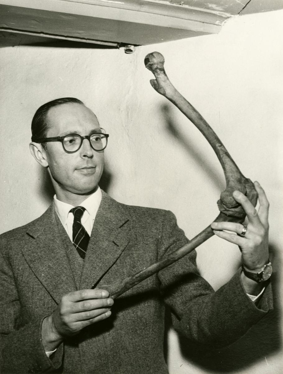 Professor Jan Mellgren, Göteborg, med Gathenhielms vänstra i knäleden hopväxta eller hopväxtra knäled. Oktober 1956.