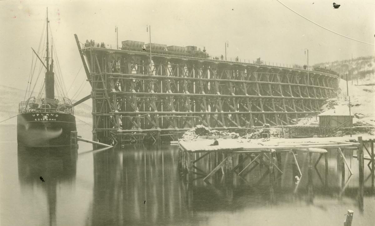 Ångfartyget UPLAND intagande första malmlasten som skeppades från Narviks hamn. Fartyget byggdes hos Joseph L. Thompson & Son, Sunderland 1888. Inköpt 1899 från Bishopsgate S.S Co., London, omdöpt till UPLAND. Såld 1915 till Afrikanska Ångfartygs AB (G. Sandström), Göteborg. Omdöpt till CAROLINA. Såld 1921 till Aug. Bolton, Hamburg, omdöpt till BOLLWERK. Återköpt 1922 till Afrikanska Ångfartygs AB i Göteborg, omdöpt till CAROLINA. Såld 1935 till Cia, Carbonifera Rio-Grandense, Rio de Janeiro, omdöpt till MACEIO. Senare försålt till Cia. Commercio e Nav, Rio de Janeiro. Nedskrotat år 1952.