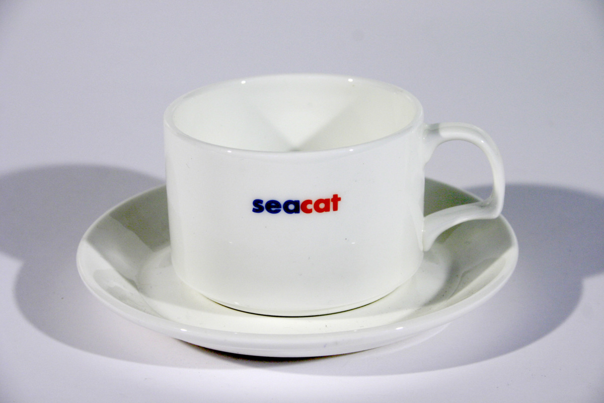 Rund kopp med raka sidor. Runt fat med spår för koppens fotring. På koppen finns texten 'seacat' där de tre första bokstäverna är blå och de övriga röda.