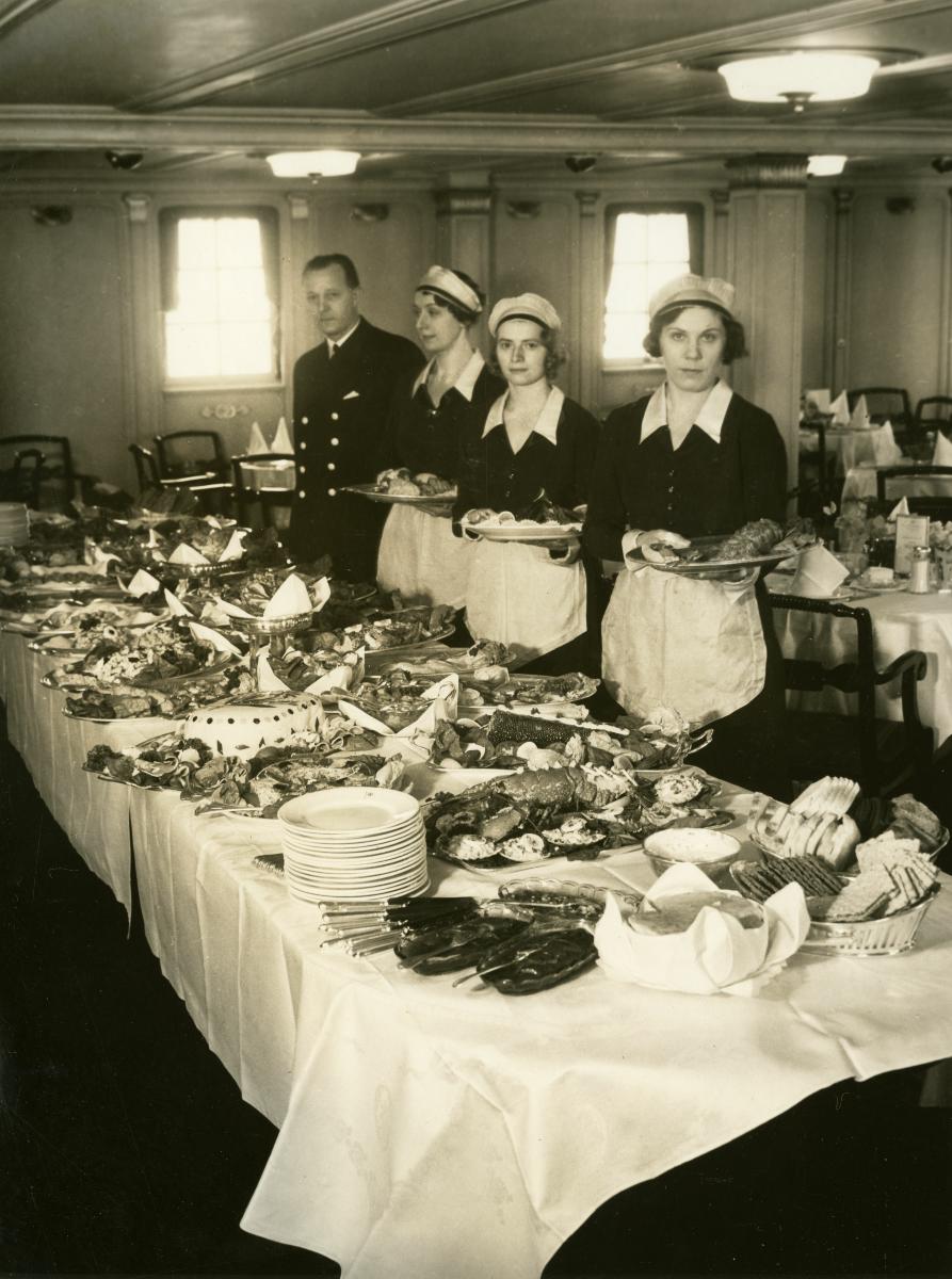Servitriser vid smörgåsbord på Svenska Lloyds fartyg