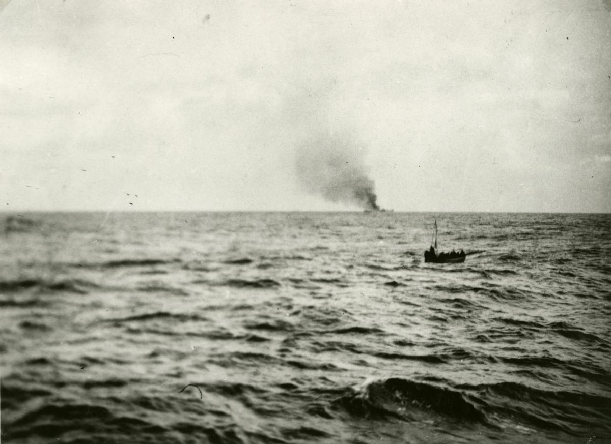 Bild från VINGALANDs krigsförlisning 8/11 1940. I förgrunden syns en livbåt med överlevande från VINGALAND. I bakgrunden syns VINGALAND i brand.