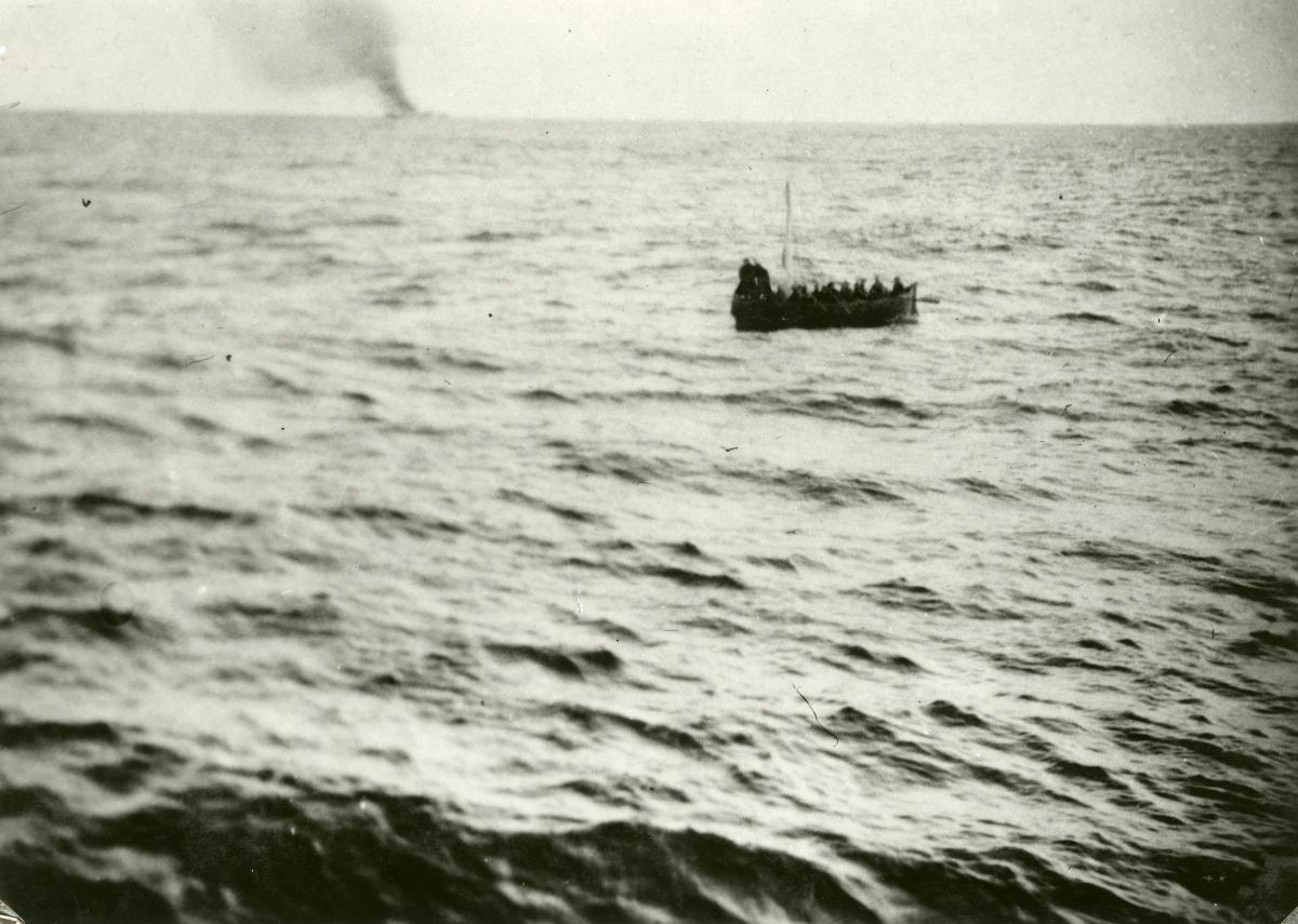 Bild från VINGALANDs krigsförlisning 8/11 1940. I förgrunden syns en livbåt med överlevande från fartyget. I bakgrunden skymtar VINGALAND i brand.