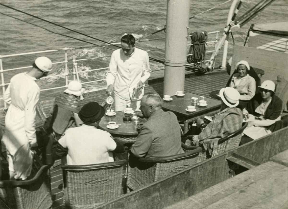 Gå tillbaka till sökLägg till i Min samlingKopiera länkSkriv utPassagerare fikar på lastfartygAktörerSvenska Orientlinjen (SOL) (*1911), RederiKategoriångfartyg (fartyg) passagerare (Personfoto) fartygsexteriör (fartyg) befäl och besättning (Personfoto) TurismMaterial och teknikPapper, FotografiInventarienummerSMGF23238UtställdInte utställd på museetBeskrivningFartyget tillhör sannolikt Svenska Orientlinjen
