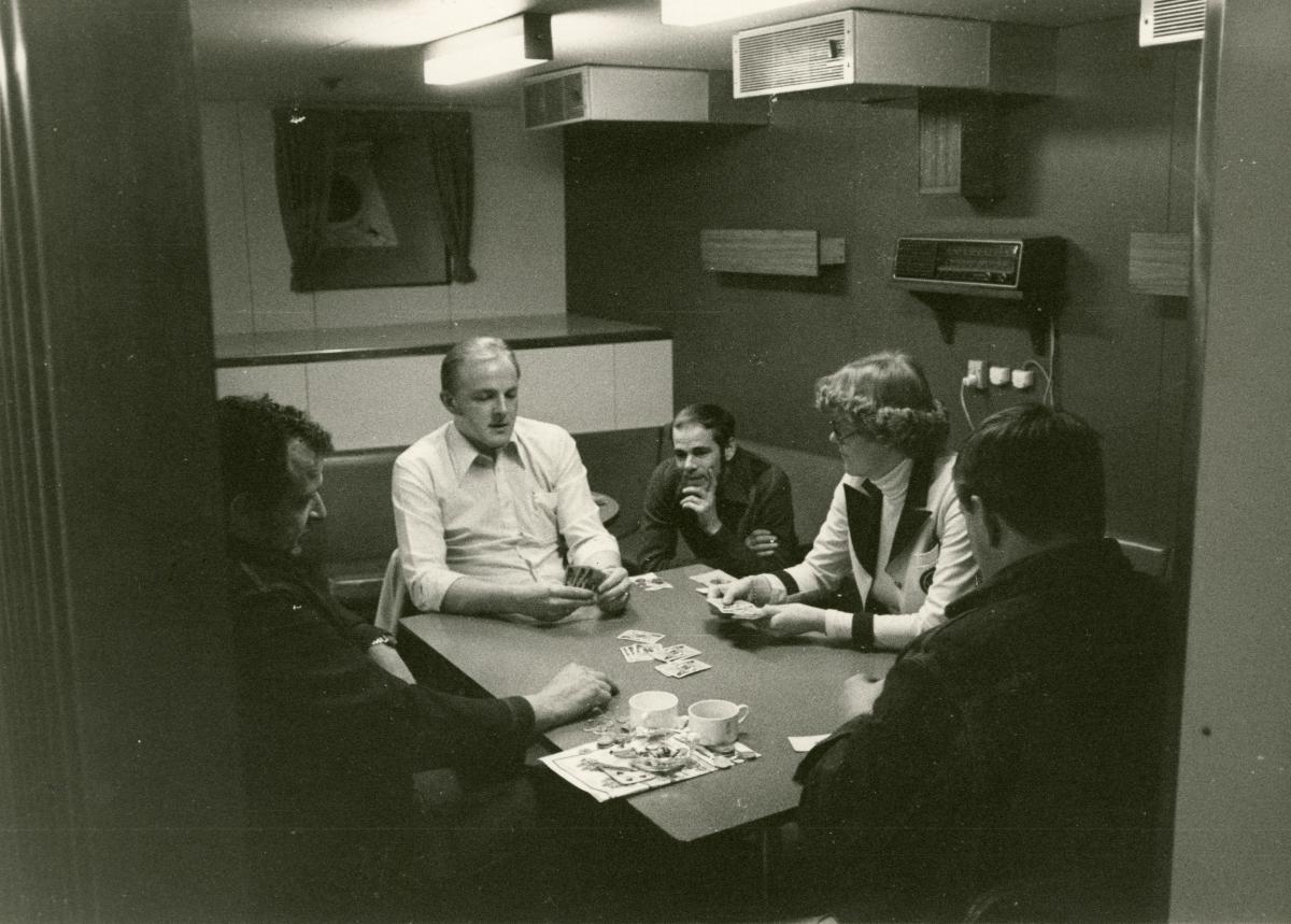 Besättning spelar kort och dricker kaffe