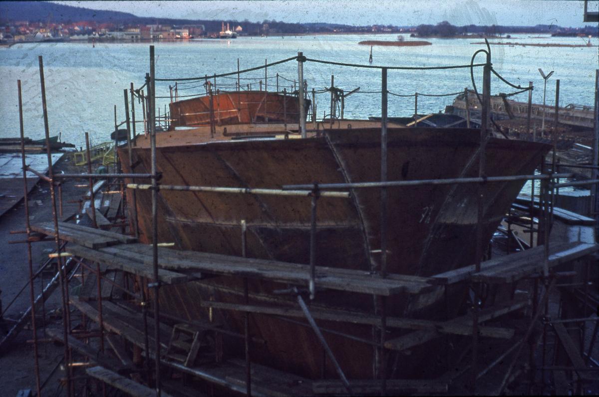 En av de så kallade "Indienbåtarna" under byggnation i Sölvesborg i december 1967. "Indienbåtarna" var två trålare som byggdes vid varvet i Sölvesborg 1967-1968 på bekostnad av SIDA. Trålarna döptes till BLUE FINN och RED SNAPPER och skänktes av SIDA till Indien.