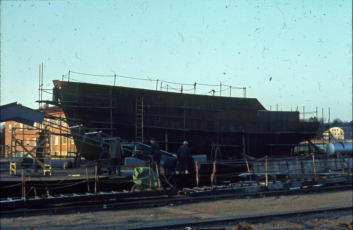 En av de så kallade "Indienbåtarna" under byggnation i Sölvesborg i december 1967. "Indienbåtarna" var två trålare som byggdes vid varvet i Sölvesborg 1967-1968 på bekostnad av SIDA. Trålarna döptes till BLUE FINN och RED SNAPPER och skänktes av SIDA till Indien.