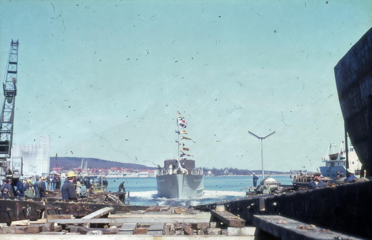 Sjösättning av trålaren RED SNAPPER 25 april 1968 vid Sölveborgs varv. RED SNAPPER var en av de så kallade "Indienbåtarna", tillsammans med BLUE FINN, vilka var två trålare som byggdes vid varvet i Sölvesborg 1967-1968 på bekostnad av SIDA. Trålarna skänktes av SIDA till Indien.