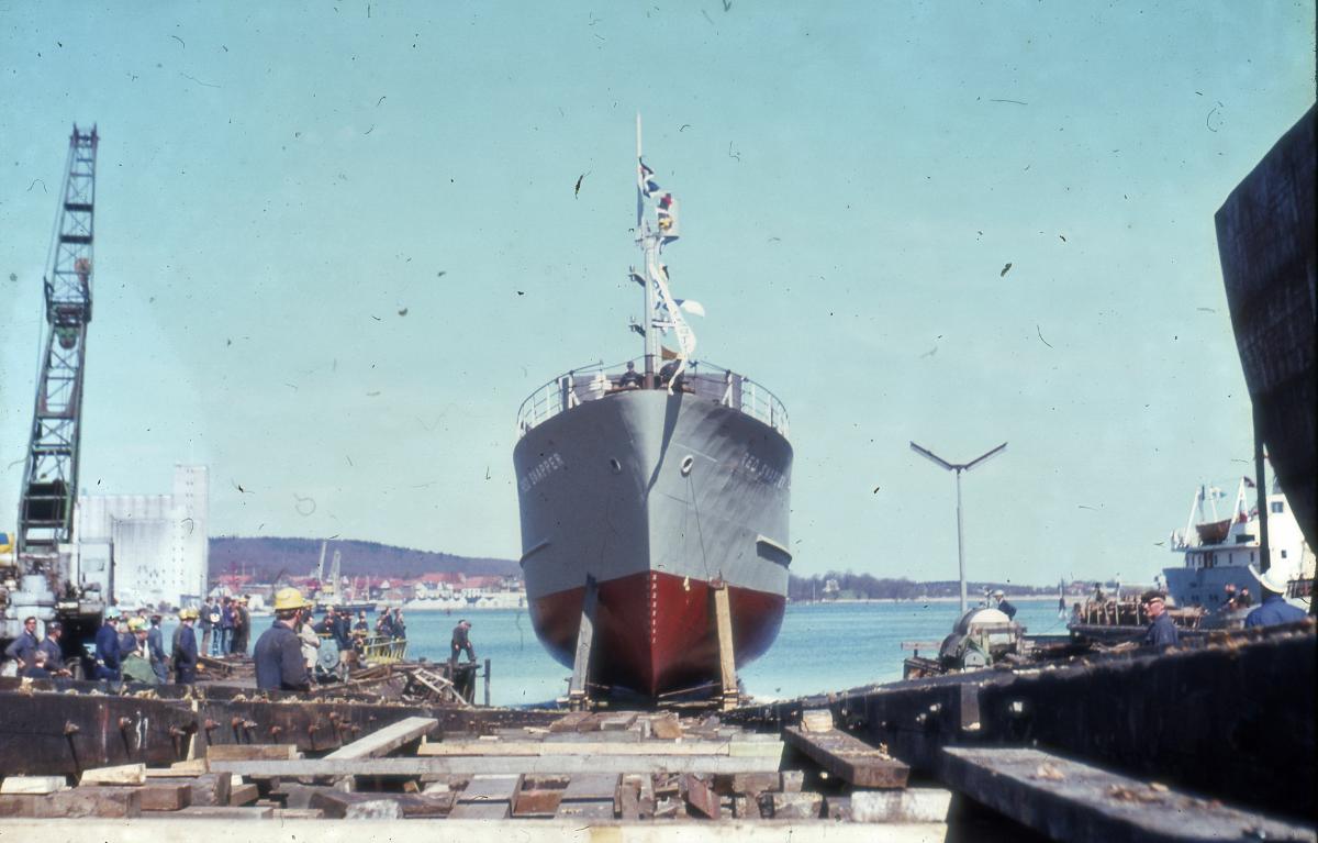 Sjösättning av trålaren RED SNAPPER 25 april 1968 vid Sölveborgs varv. RED SNAPPER var en av de så kallade "Indienbåtarna", tillsammans med BLUE FINN, vilka var två trålare som byggdes vid varvet i Sölvesborg 1967-1968 på bekostnad av SIDA. Trålarna skänktes av SIDA till Indien.