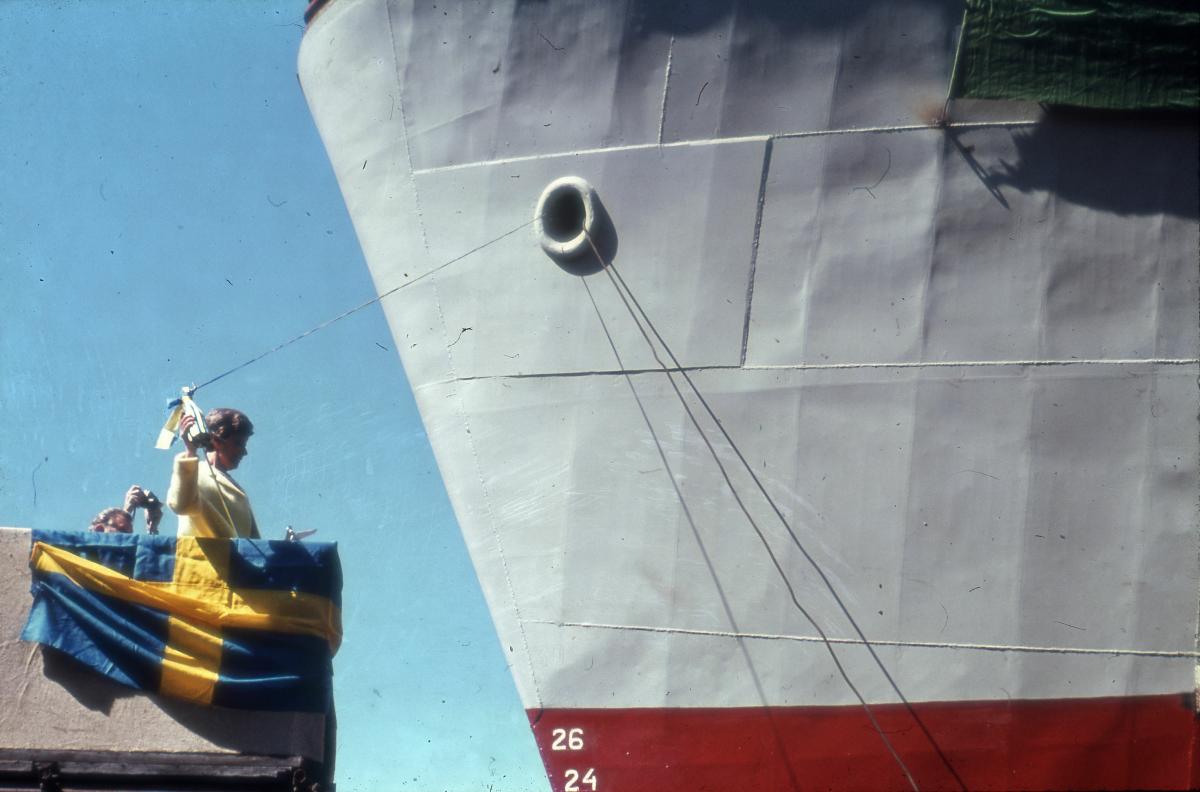 Sjösättning av trålarna BLUE FIN och RED SNAPPER 25 april 1968 vid Sölveborgs varv. Dessa så kallade "Indienbåtar" var två trålare som byggdes vid varvet i Sölvesborg 1967-1968 på bekostnad av SIDA. Trålarna skänktes av SIDA till Indien.