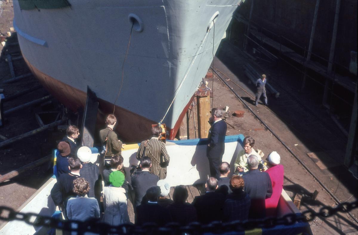 Sjösättning av trålarna BLUE FIN och RED SNAPPER 25 april 1968 vid Sölveborgs varv. Dessa så kallade "Indienbåtar" var två trålare som byggdes vid varvet i Sölvesborg 1967-1968 på bekostnad av SIDA. Trålarna skänktes av SIDA till Indien.