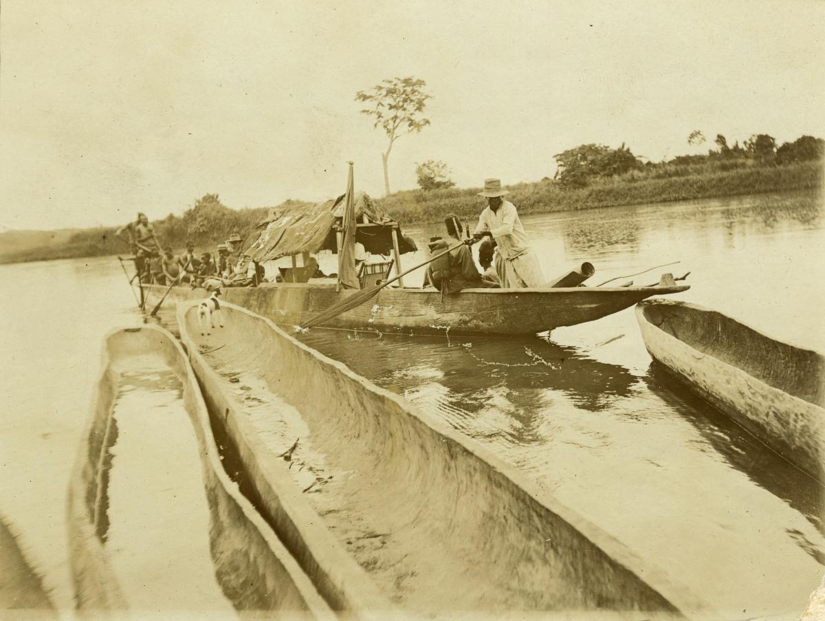 Piroger på floden Lualaba, Kongoflodens största biflod, under den första officiella transporten på sträckan Kongolo - Bukama