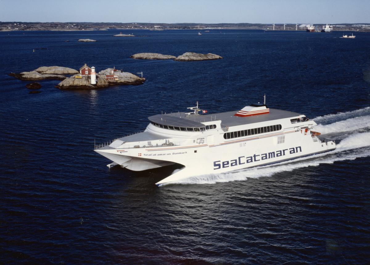 Katamaranen SEACAT är på väg ut från Göteborg och passerar precis Vinga fyrplats. Sannolikt är fartyget på väg mot Fredrikshamn. I bakgrunden skymtar de yttre delarna av Göteborgs hamn