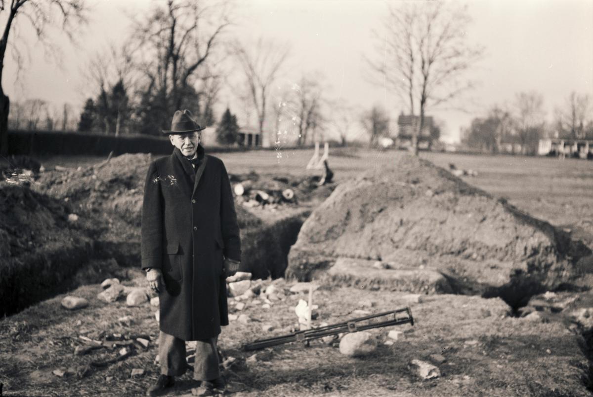 Motivet visar en person stående vid utgrävning vid en plats med koppling till kolonin Nya Sverige