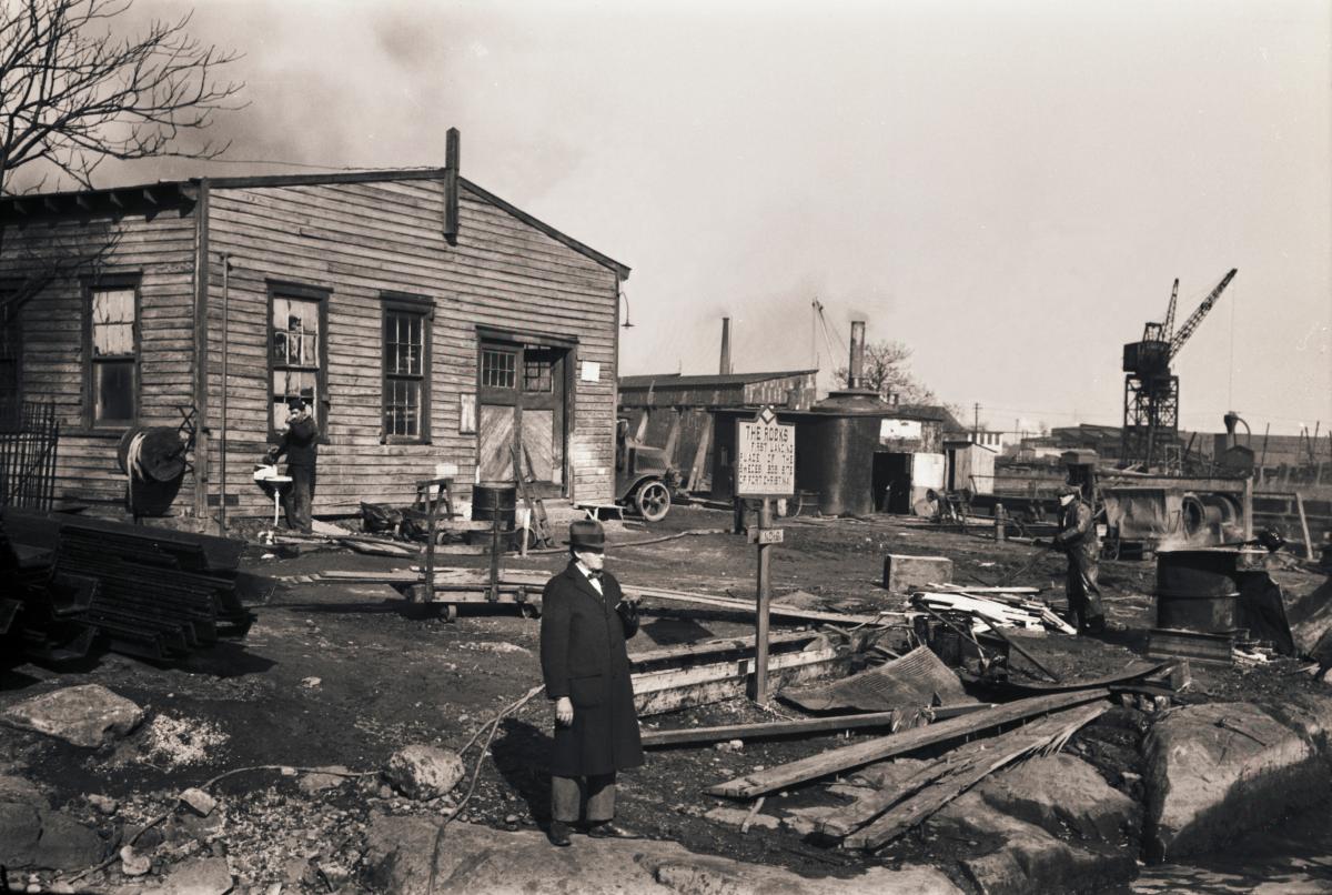 Fotografi taget 1937 under museichef Olof Traungs resa till USA. Bilden visar platsen The Rocks där de första svenska kolonisatörerna landsteg 1638.