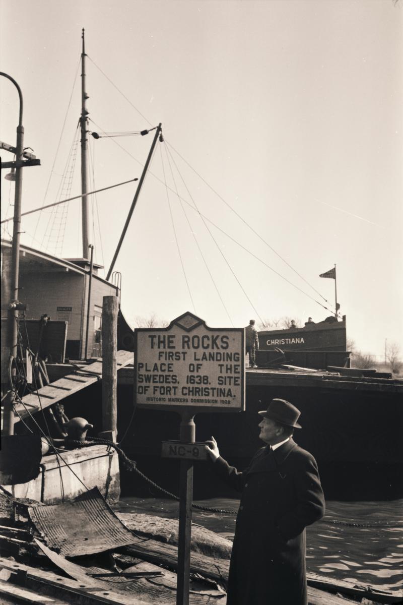 Fotografi taget 1937 under museichef Olof Traungs resa till USA. Bilden visar platsen The Rocks där de första svenska kolonisatörerna landsteg 1638.