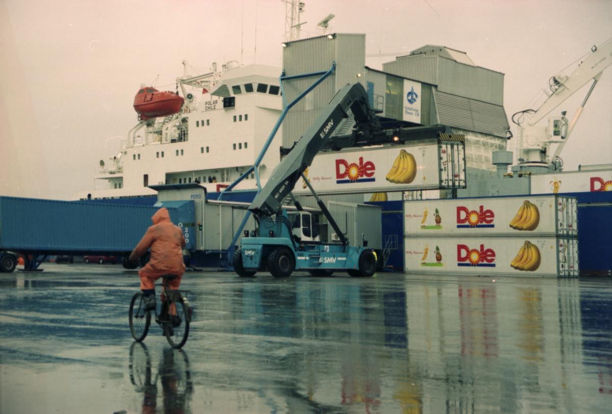 Containrar med bananer, av märket Dole, lossas i Göteborgs hamn. Sannolikt är fotografiet taget i Skandiahamnen.