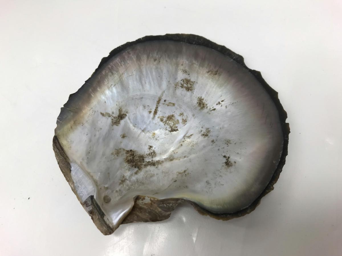 Snäcka. Förvarades i en cigarrask som använts som förvaringslåda för material för sjömansarbete och färdiga produkter.