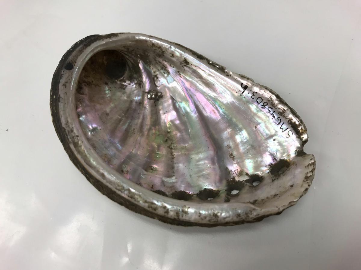 Snäcka. Förvarades i en cigarrask som använts som förvaringslåda för material för sjömansarbete och färdiga produkter.