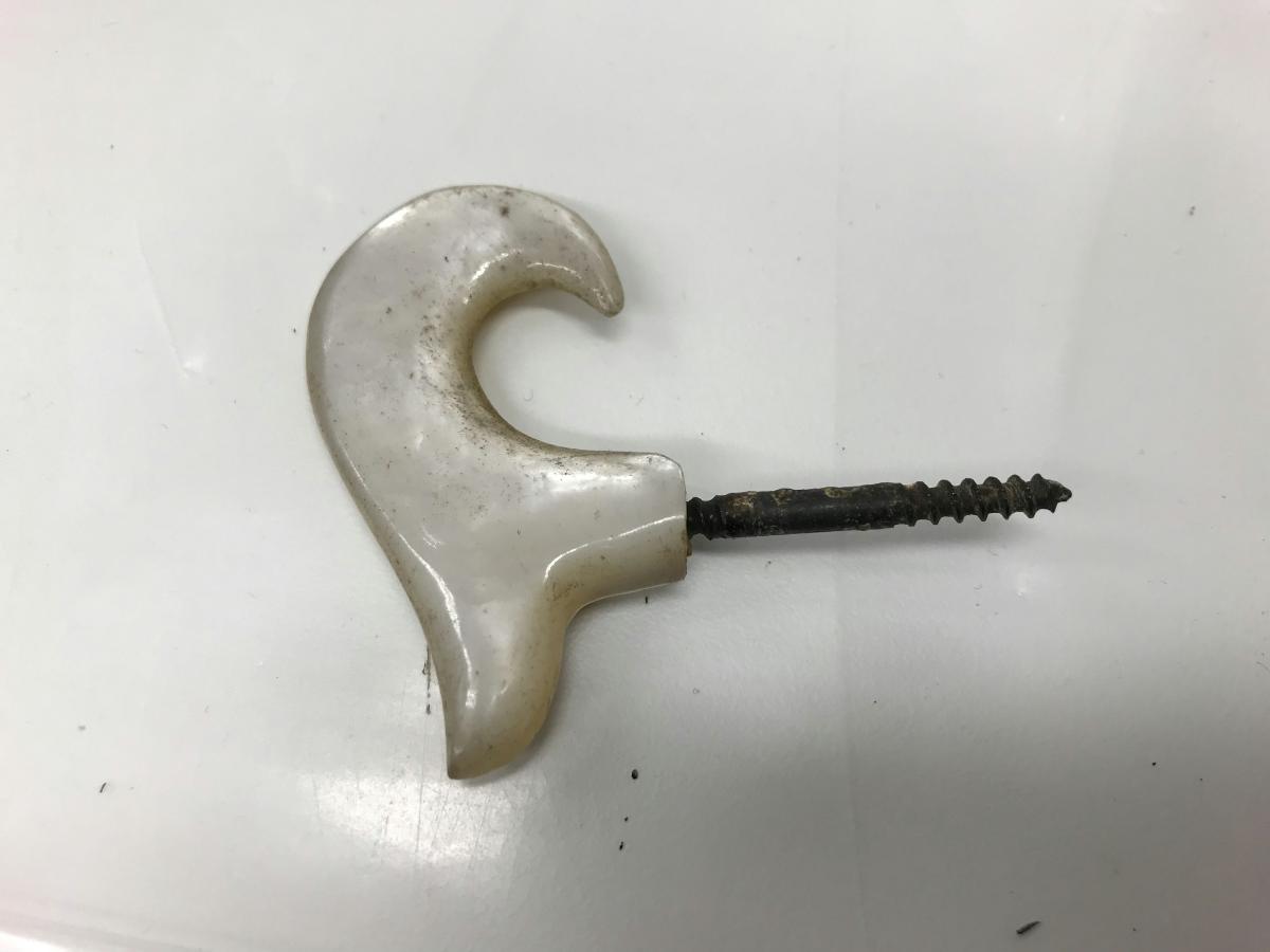 Handtag i pärlemor märkt "Rencke 73". Förvarades i en cigarrask som använts som förvaringslåda för material för sjömansarbete och färdiga produkter.