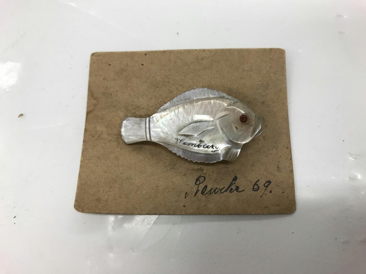 Brosch i pärlemor föreställande en fisk, sitter på en pappersbit märkt "Rencke 69". Förvarades i en cigarrask som använts som förvaringslåda för material för sjömansarbete och färdiga produkter.