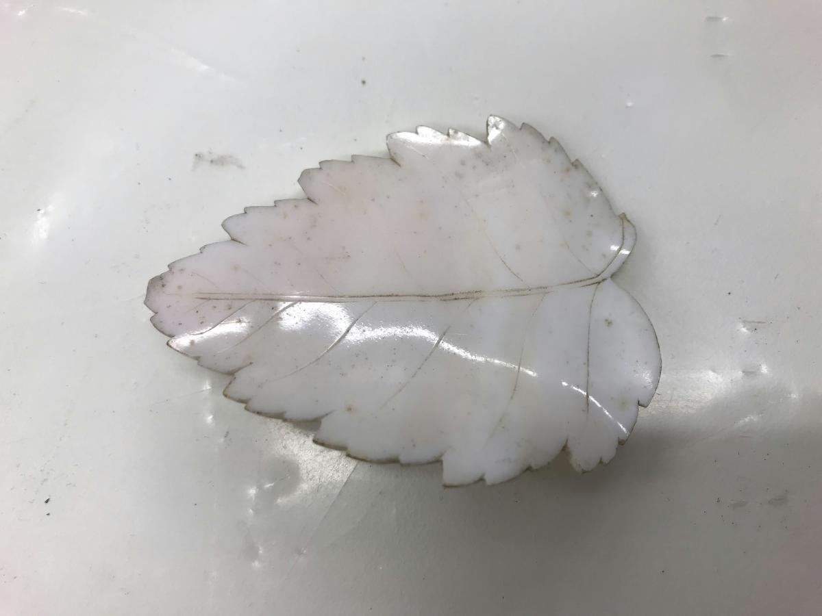 Brosch i pärlemor föreställande ett löv, märkt "Rencke 41". Förvarades i en cigarrask som använts som förvaringslåda för material för sjömansarbete och färdiga produkter.