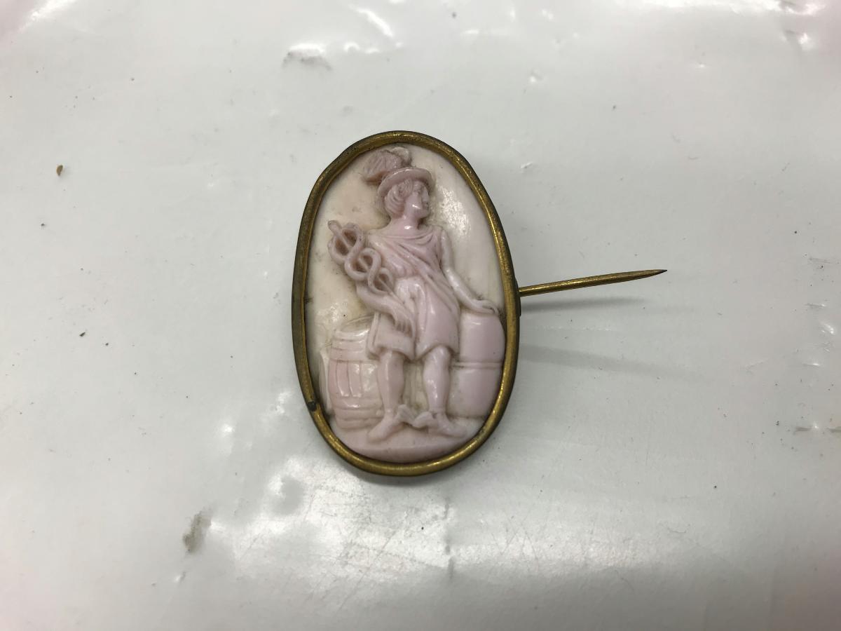 Brosch, kamé i pärlemor och metall, föreställande en man stående framför två tunnor, mannen håller en Asklepiosstav (en stav med två ormar) märkt "Rencke 43". Förvarades i en cigarrask som använts som förvaringslåda för material för sjömansarbete och färdiga produkter.