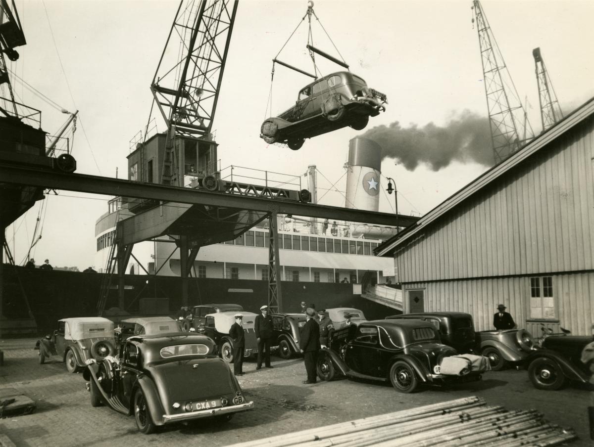 På bilden syns bilar som ska lastas på Svenska Lloyds SUECIA. Bilarna tillhör någon av de 286 passagerarna ombord. En bil är i luften. Bilarna på kajen närmast kameran är brittiska. Fotografiet är sannolikt taget i Göteborg.
