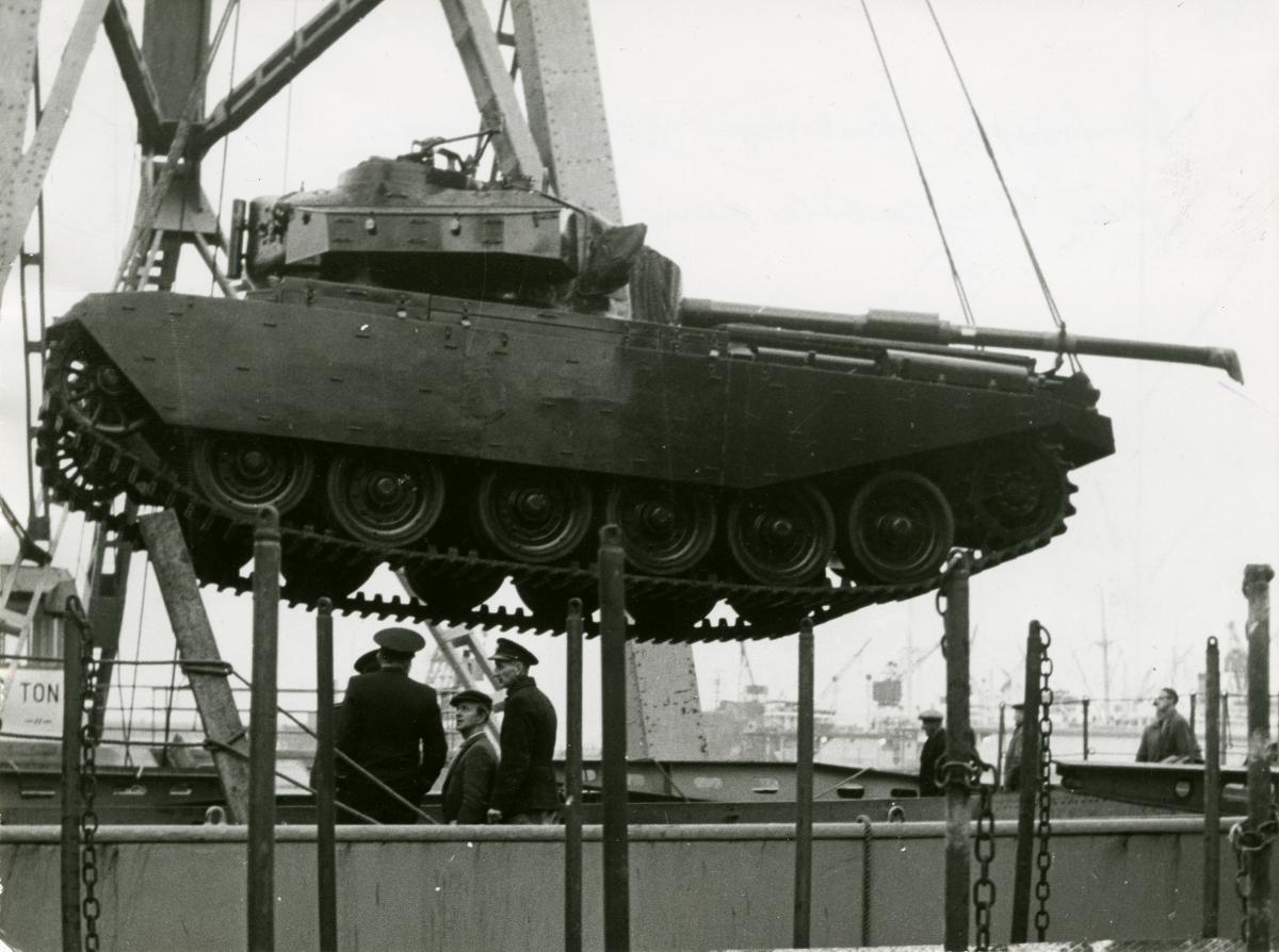 Påskrift: 27/11 1959: En av de Centurion stridsvagnar som inköptes i England av svenska staten, lossas från "Celia"
