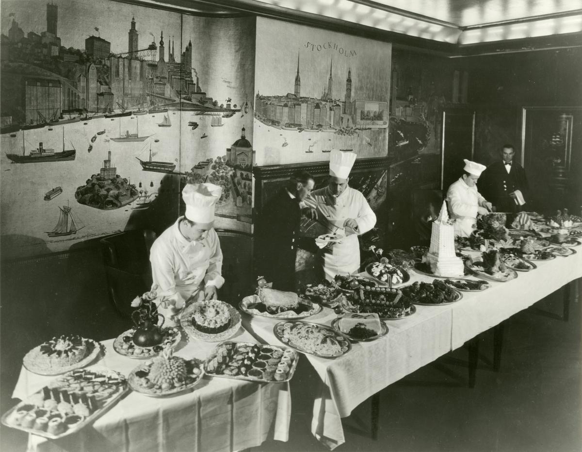 Personal ombord KUNGSHOLM förbereder en buffé/smörgåsbord för passagerarna. Bilden är tagen i första klass rökrum. Väggmålningarna i bakgrunden, som visar Stockholm, är målade av Kurt Jungstedt. Gjutjärnsspisen är formgiven av Anna Petrus. Beskrivning ur katalog Svenska Amerika Linien, Sverige direkt Amerika: "En djärv färgsymfoni i guld, rött och svart med Kurt Jungstedts väldiga väggmålningar från Stockholm och New York som dominerande element."