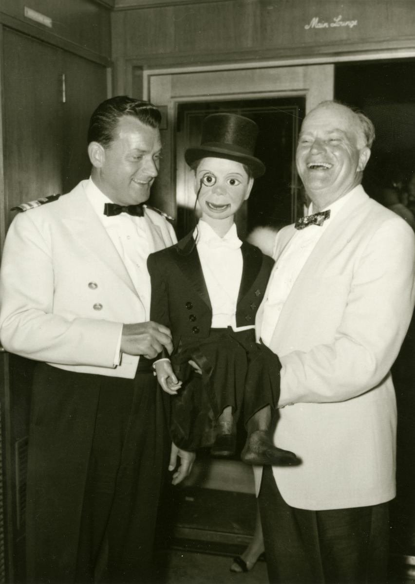 Purser Curt Dawe med buktalaren Edgar Bergen (1903-1978) och hans docka Charlie McCarthy. Bergen var son till svenska amerikaemigranter och känd buktalare i USA.