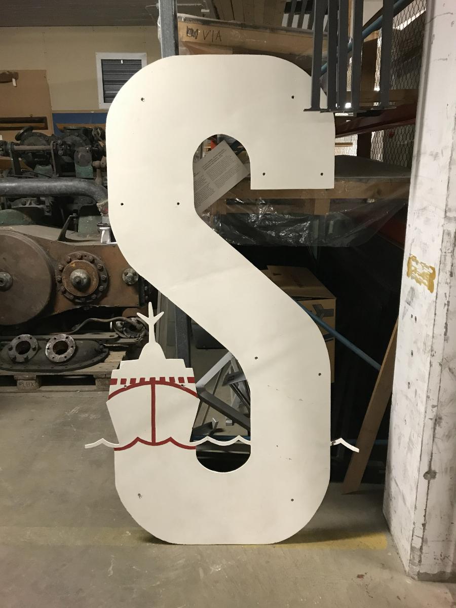 Skorstensmärke för Stena Line i form av ett stort S med ett fartyg sett från fören på bokstavens nedre båge.