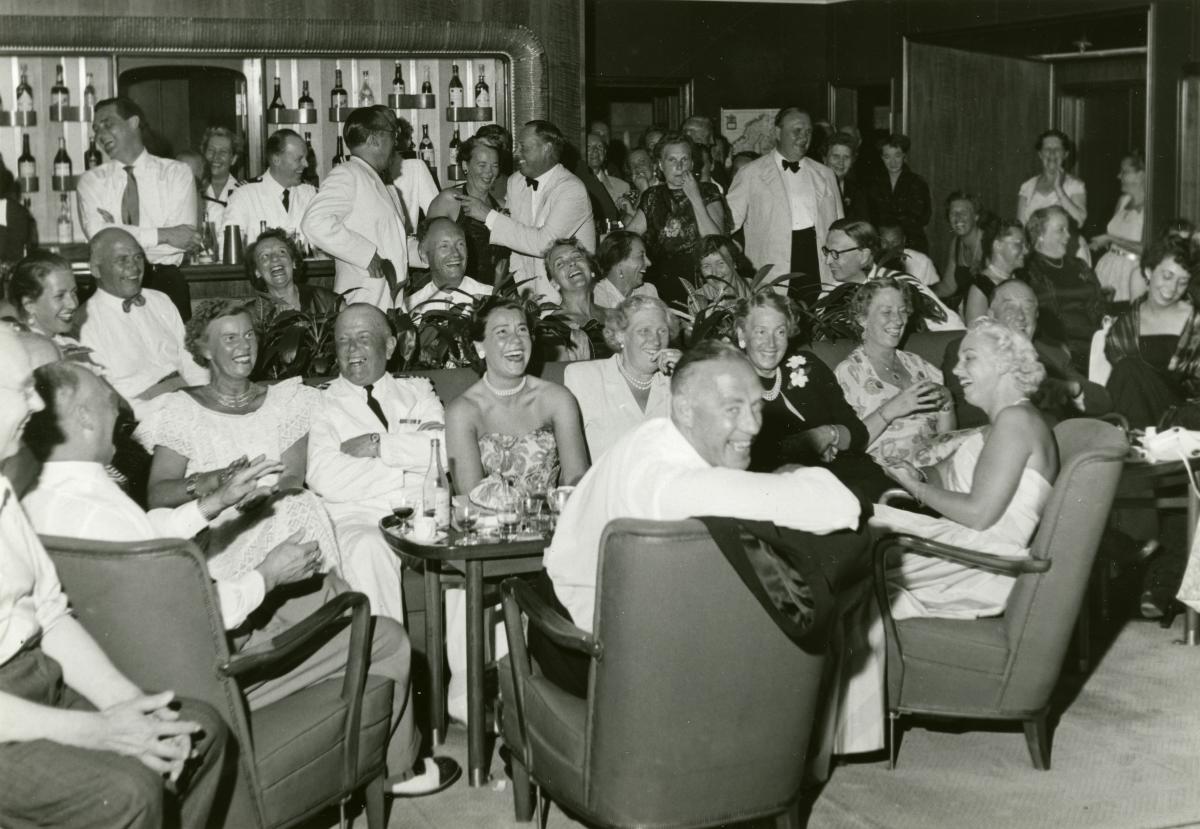 Passagerare trängs kring bord och i baren ombord PATRICIA under perioden 1951-1957. Fotot är sannolikt taget under PATRICIAs kryssning till Medelhavet i september 1954.
