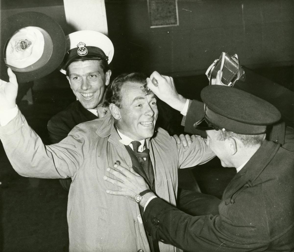 Skådespelaren och komikern Nils Poppe passerar tullen på väg in i Sverige efter att ha rest från England med Rederi AB Svenska Lloyds fartyg SUECIA. En av tulltjänstemännen stämplar honom i pannan.