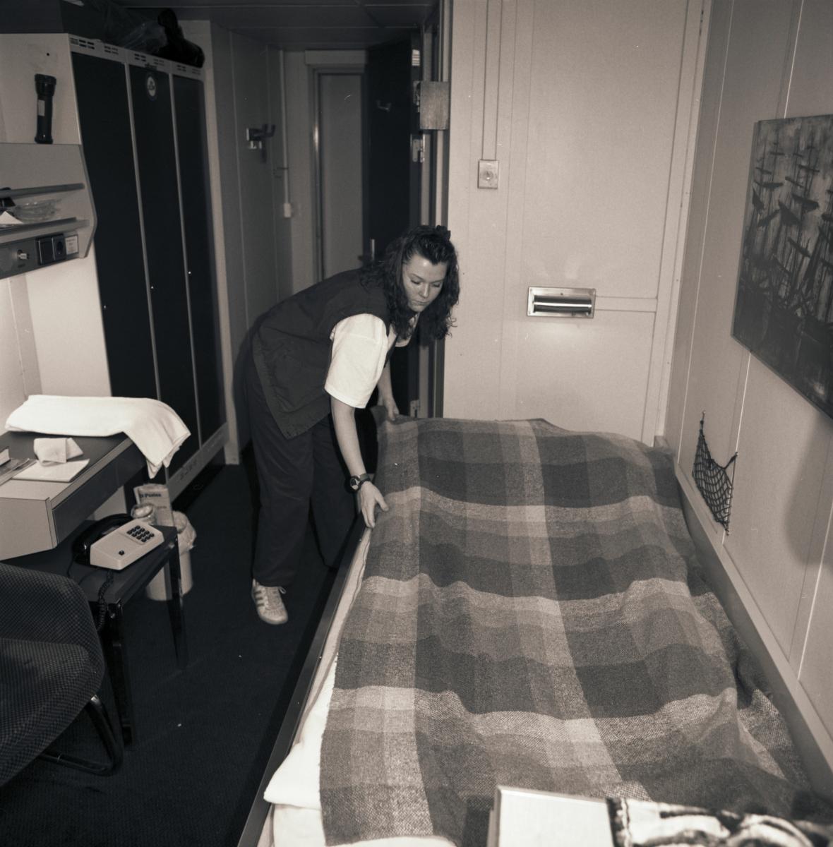 Besättningsperson bäddar sängar i en hytt ombord ett av Stena Lines Danmarksfartyg.