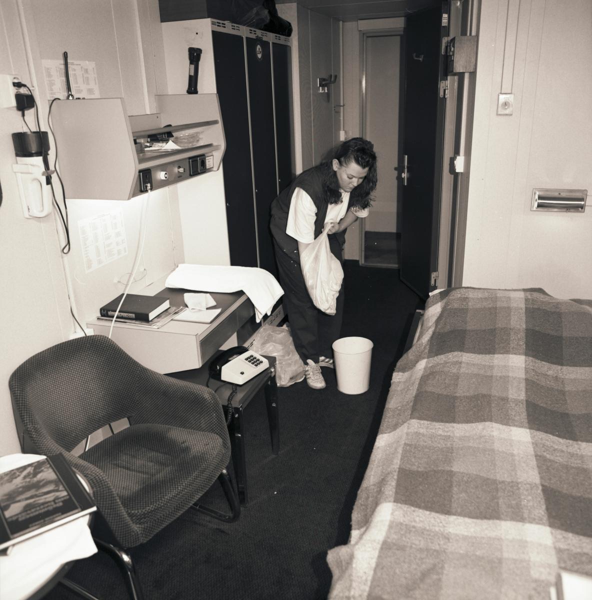 Besättningsperson byter papperskorg i en hytt ombord ett av Stena Lines Danmarksfartyg.