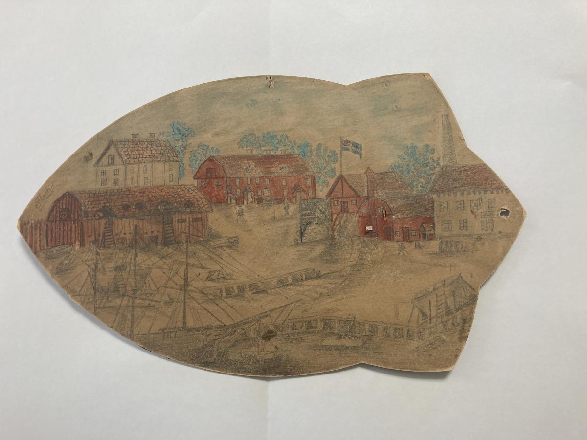Teckningen är målad på kartong, på baksidan av en årskalender från 1885. Unionsflaggan som syns i teckningen gör att den föreställer varvet före 1905.