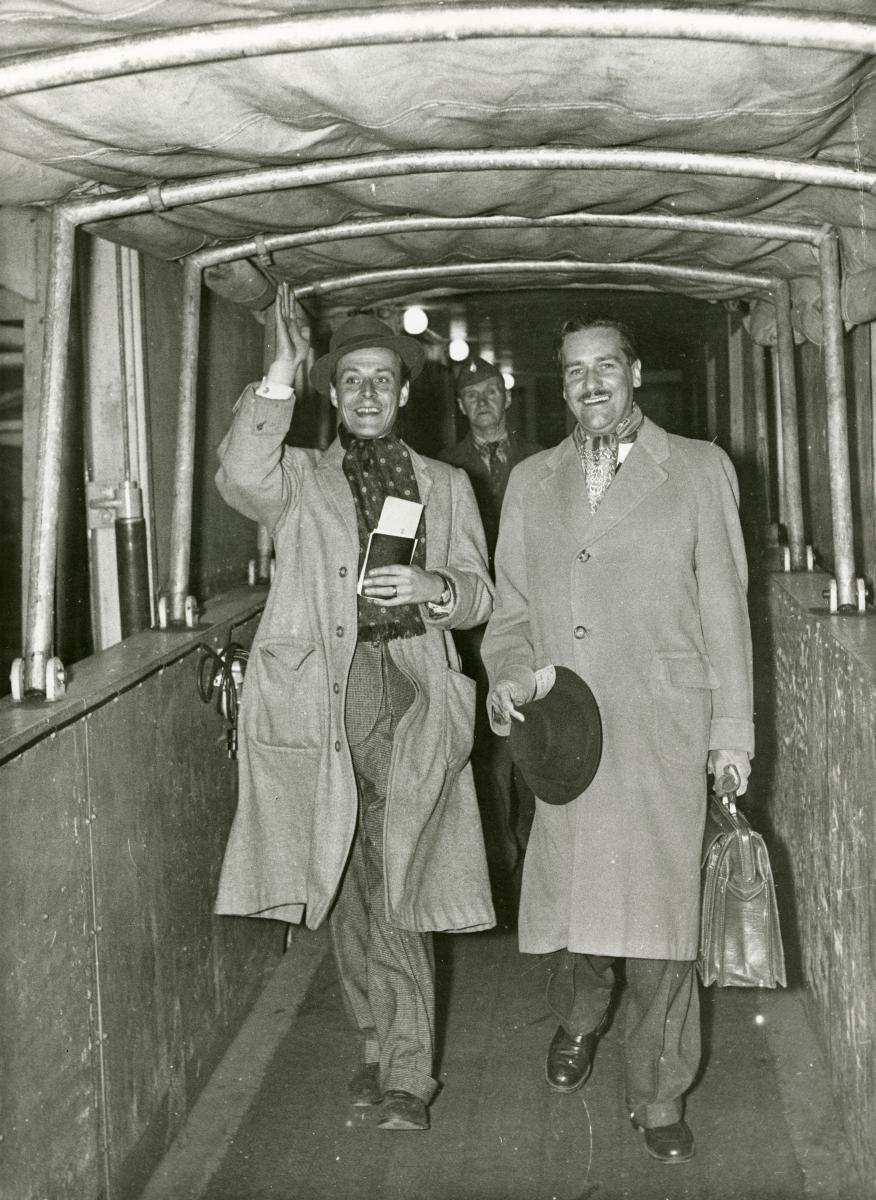Regissör Hasse Ekman med följe på väg ombord i eller av ett av Rederi AB Svenska Lloyds fartyg.