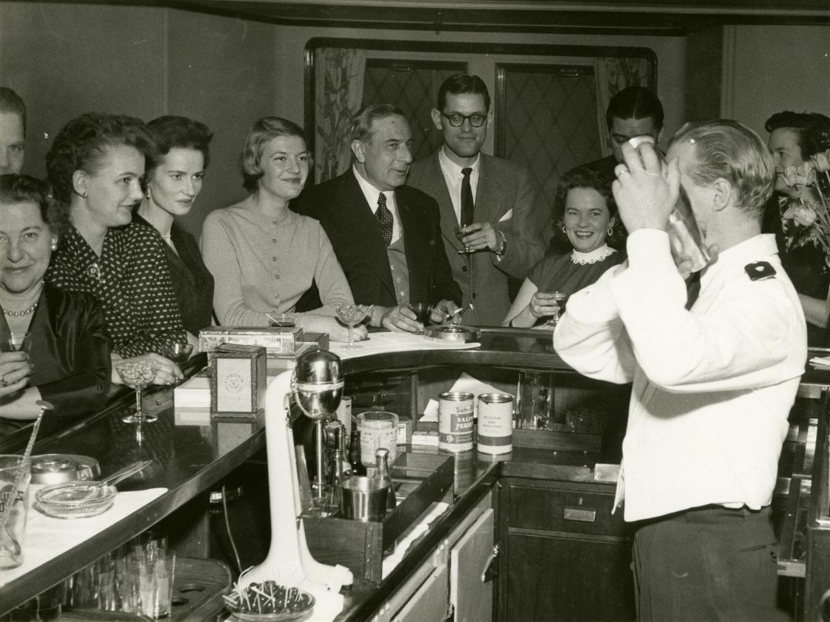 Gästerna trängs i baren på M/S SAGA och Bartendern blandar drinkar.