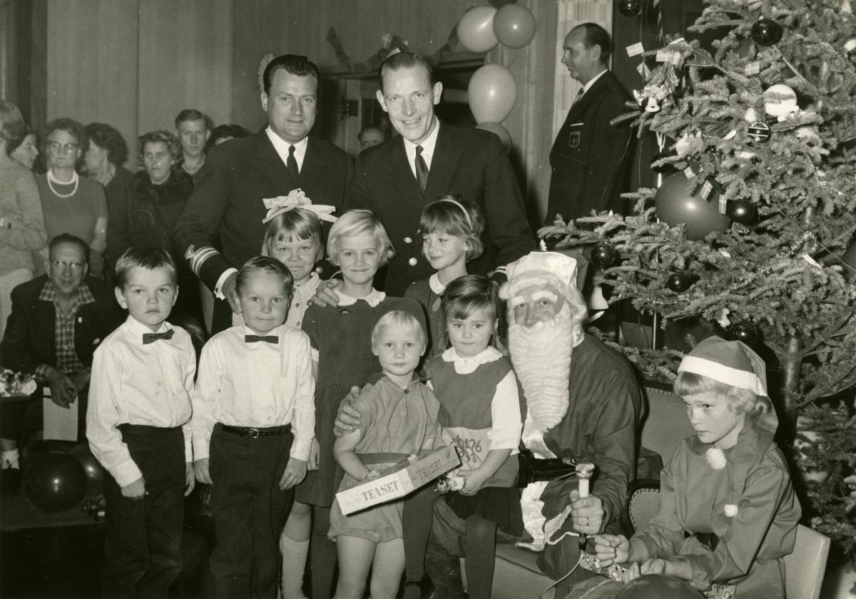 Curt Dawe poserar med barn och jultomten ombord på ett av Svenska Amerika linjens fartyg.