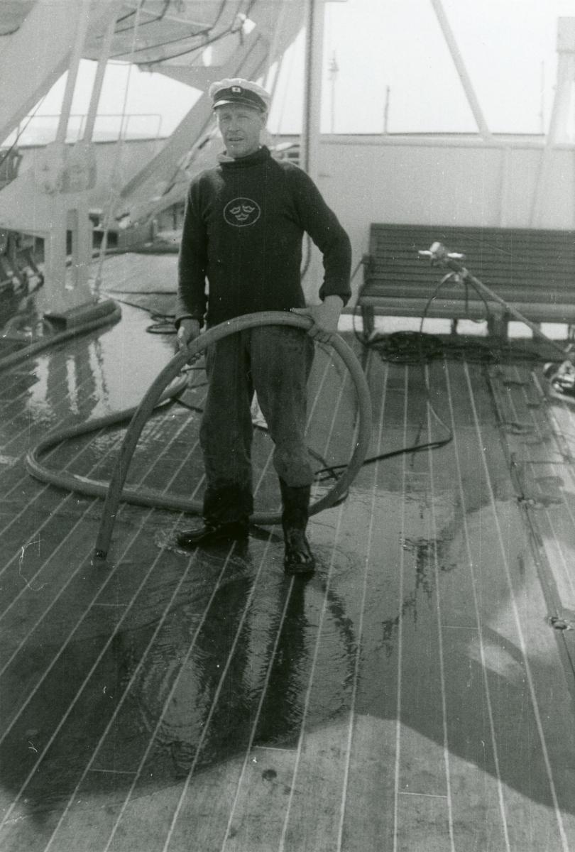 En besättningsmedlem på ett av Svenska Amerika linjens fartyg spolar däck. I bakgrunden syns en skurmaskin.