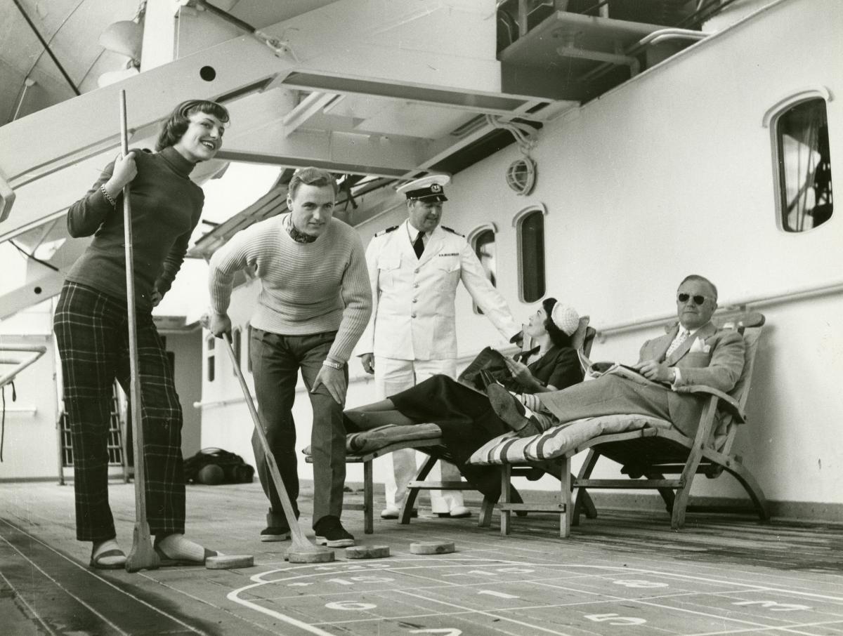 Två passagerare spelar däcksshuffleboard ombord på ett av svenska Amerikalinjens fartyg. befäls person konverserar dam i vilstol som beskådar spelet.