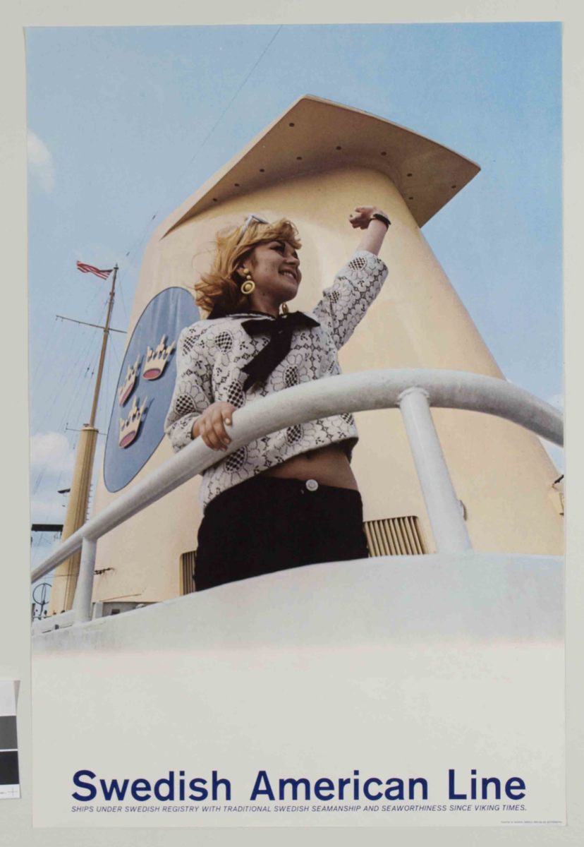 Reklamaffisch för Svenska Amerika Linen, sannolikt från 1960-talet. På bilden syns en kvinna som vinkar, stående framför en skorsten på ett av rederiets fartyg. En amerikansk flagga är hissad i bakgrunden. Texten på affischen är på engelska och anspelar på lång svensk sjöfartstradition sedan vikingatiden.