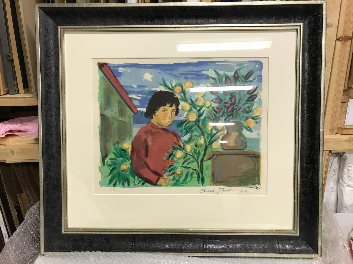 Inramat grafiskt tryck i svart ram föreställande En kvinna klädd i rött stående i en apelsinlund bredvid en husgavel. Till höger om kvinnan finns en stor kruka med en växt med röda och gröna blad.