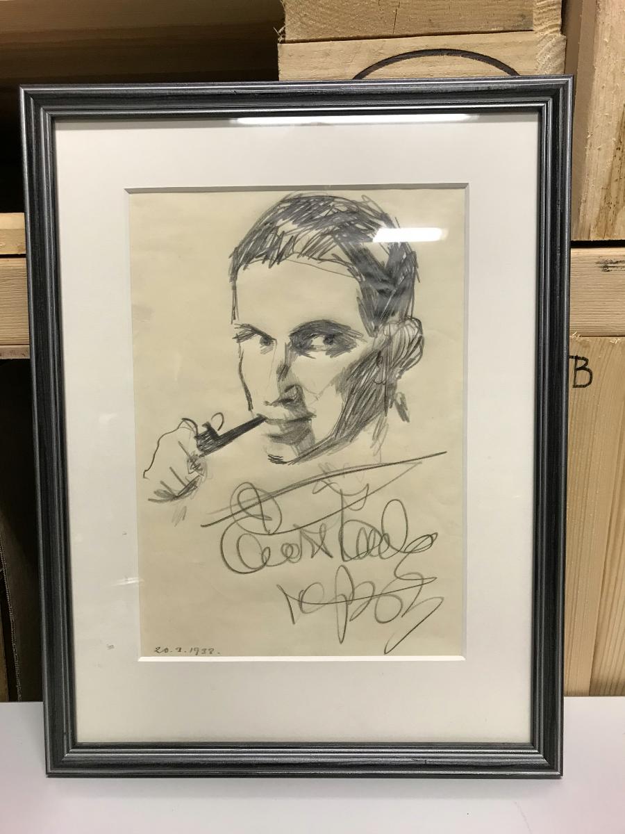 Inramad teckning föreställande en rökande man.