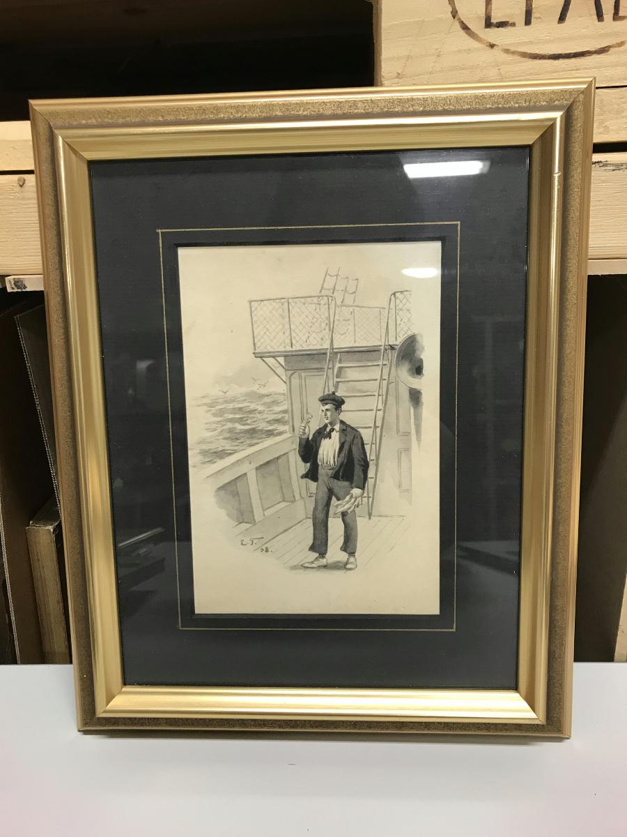 Inramad teckning föreställande en man gående på däck. Han har en skiftnyckel och en trasa i sin hand.