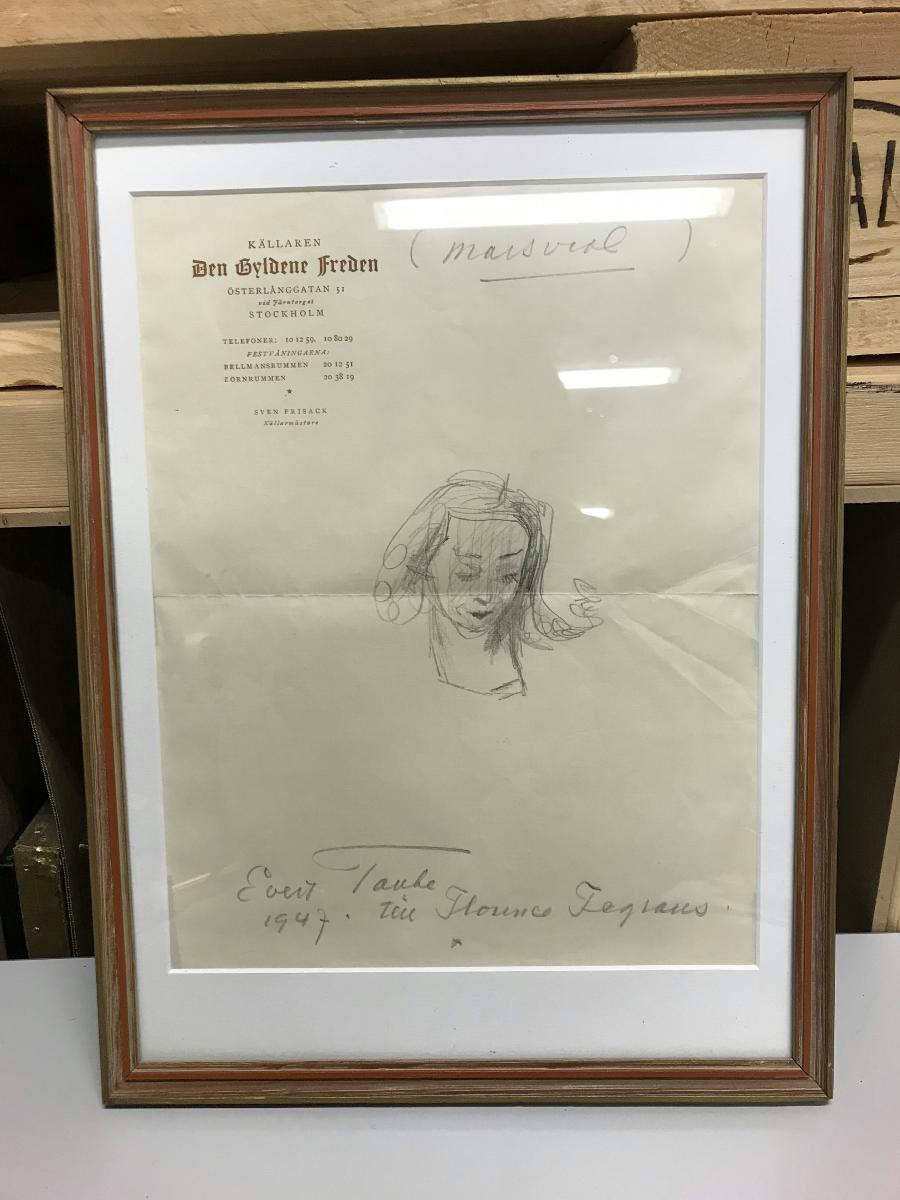 Inramad teckning på restaurang Källaren Den Gyllene Fredens brevpapper föreställande ett kvinnoansikte.